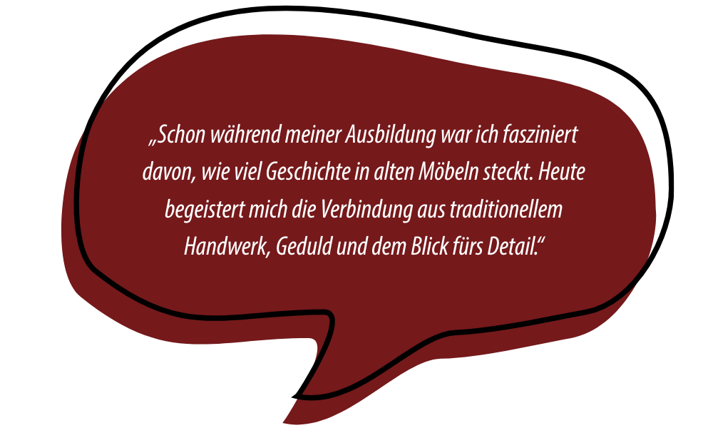 Als gelernte Schreinerin und staatlich geprüfte Restauratorin für Möbel und Holzobjekte verbinde ich traditionelles Handwerk mit einem Blick für das Besondere. Ob im Möbelbau oder in der Restaurierung: Mir ist wichtig, mit Sorgfalt, Fachwissen und Respekt vor dem Material zu arbeiten. Dabei liegt mir vor allem eines am Herzen – die Qualität meiner Arbeit und der persönliche Kontakt zu meinen Auftraggeber:innen.